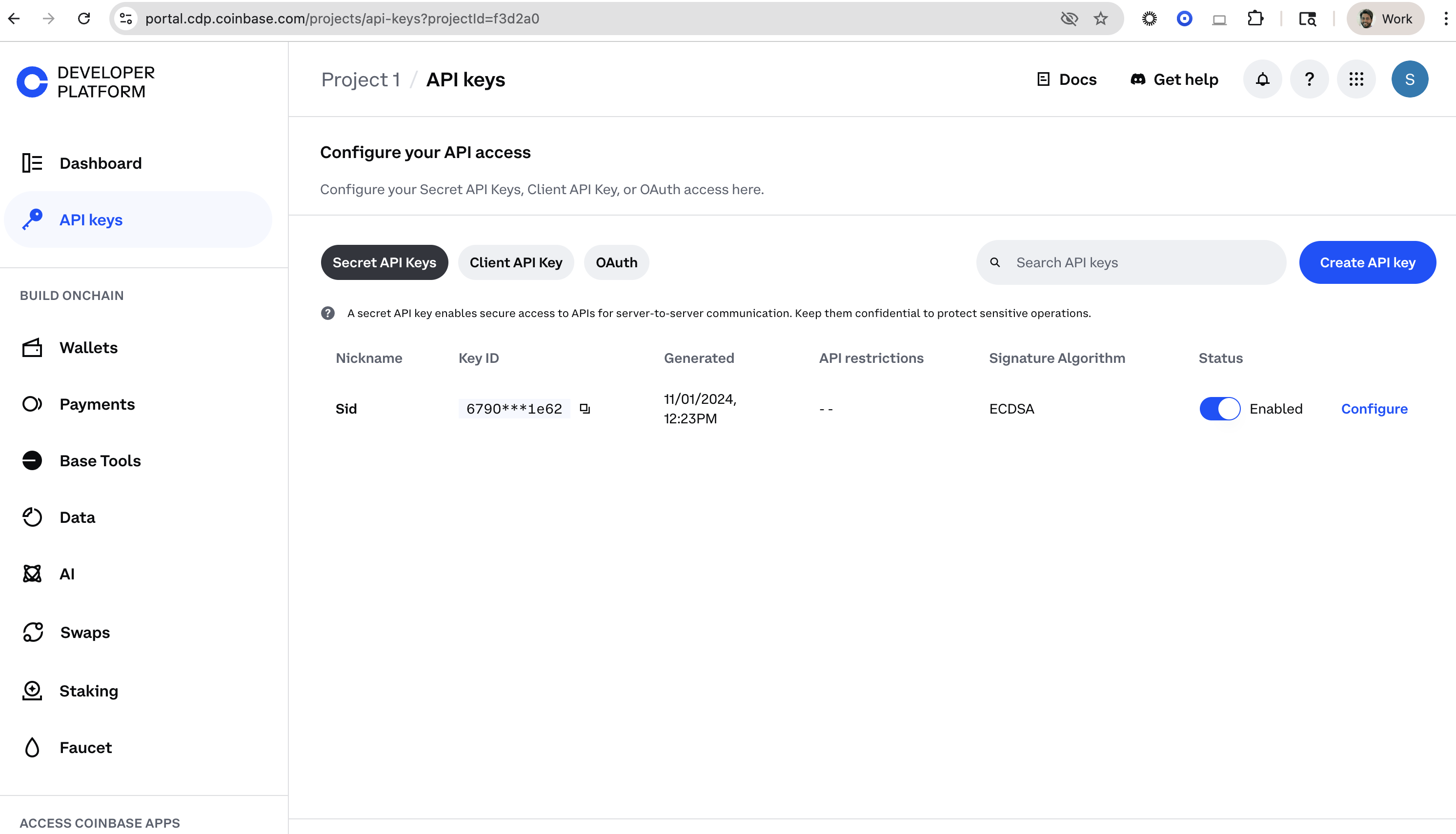 - Click the Create API key button.