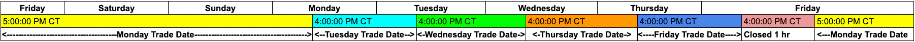 | Friday | Thursday 4:00 PM CT – Friday 3:59 PM CT |
