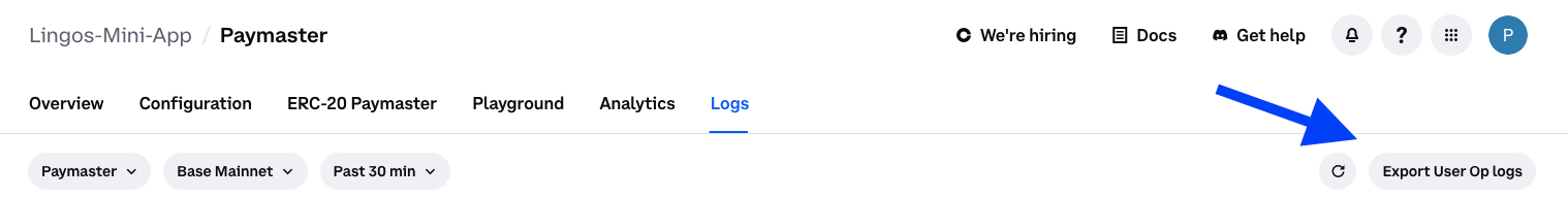 Navigate to theLogs tab in the paymaster tool and click the Export User Op logs button.