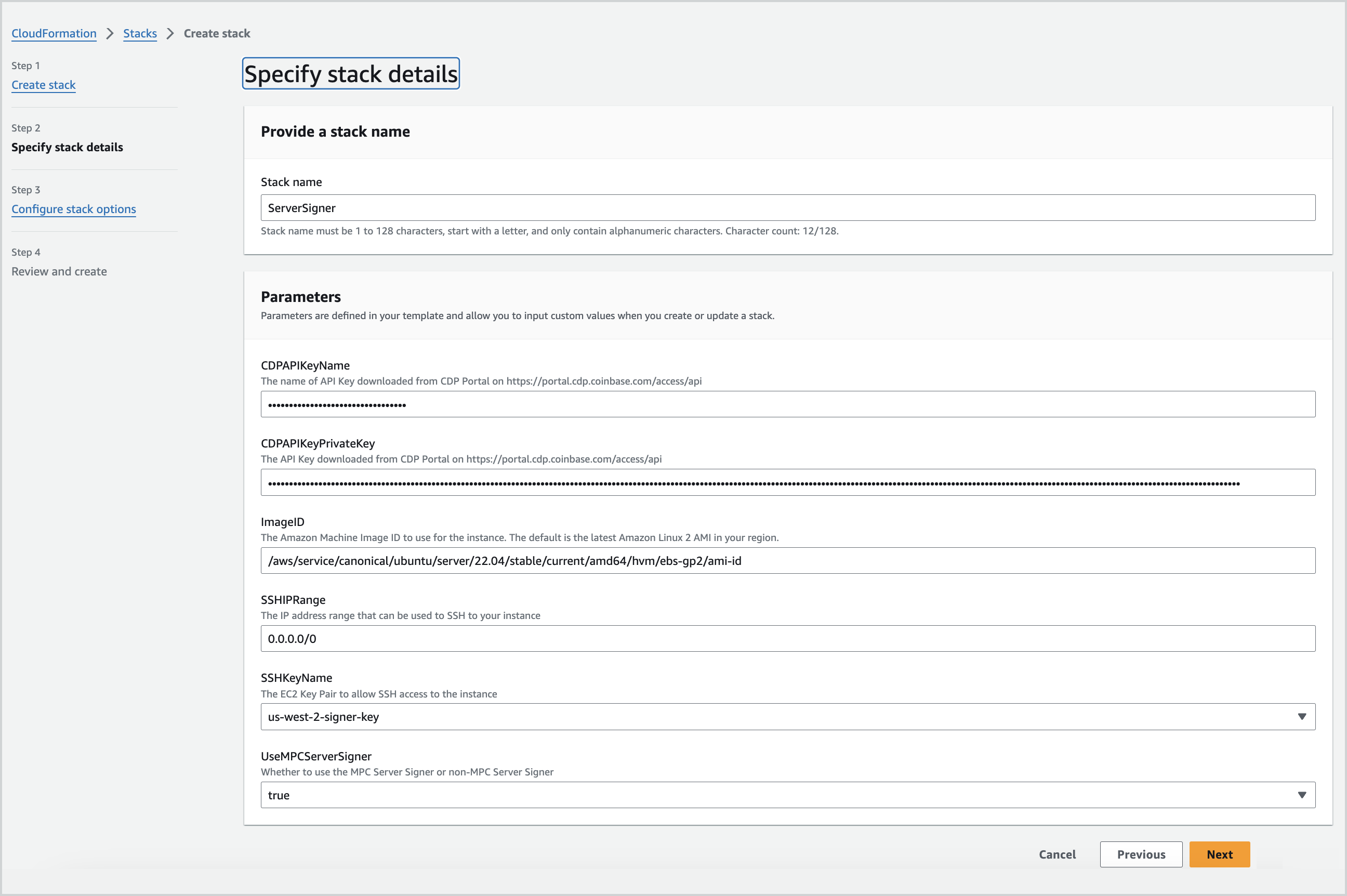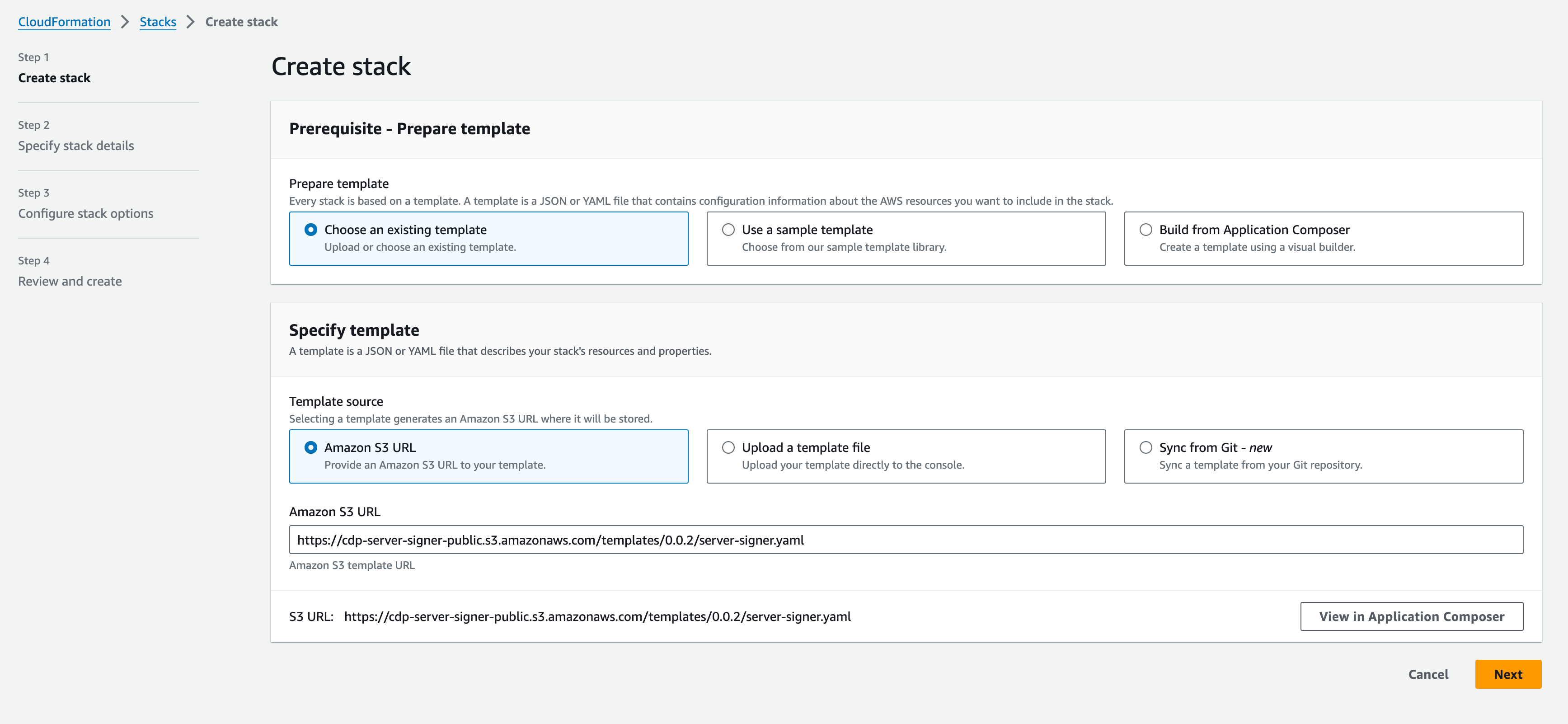 - Paste the URL https://cdp-server-signer-public.s3.amazonaws.com/templates/0.0.15/server-signer.yaml in the Amazon S3 URL field.