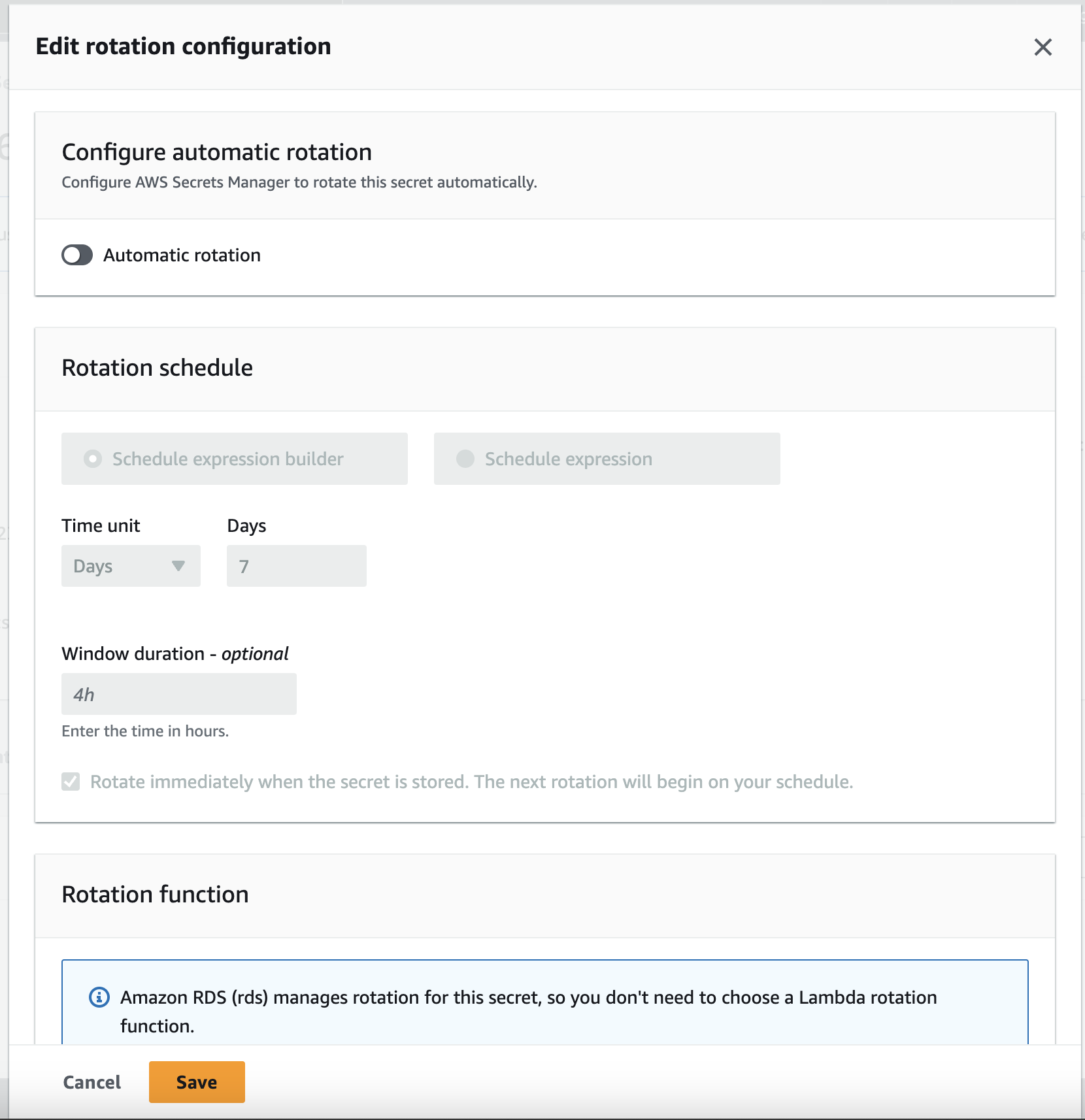 The RDS cluster is created with auto-rotation enabled by default for the database password. However, the stack does not account for the default 7-day rotation policy, and it is necessary to disable it. To disable the rotation policy, follow the steps below:- Go to AWS Secrets Manager here.
