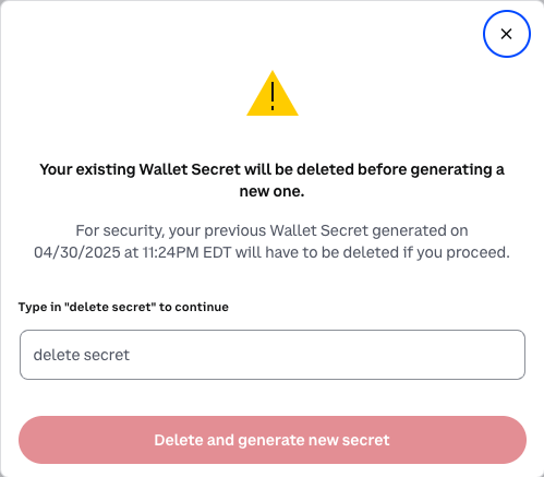 - Under Configuration, you should see when your current Wallet Secret was generated. Click the Generate new secret button to rotate your secret.