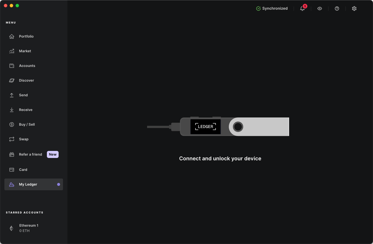 - Connect your Ledger to your computer and unlock it with your PIN.