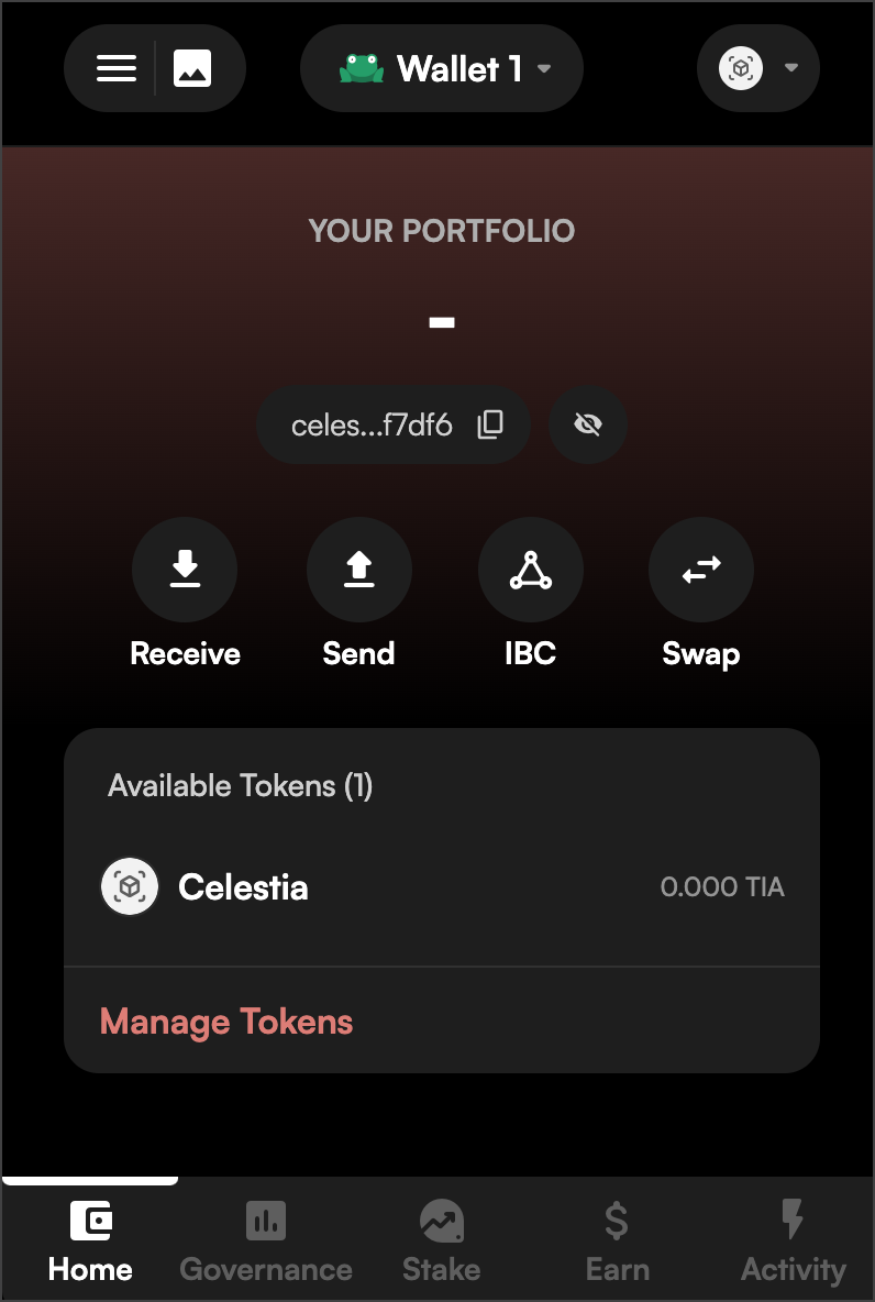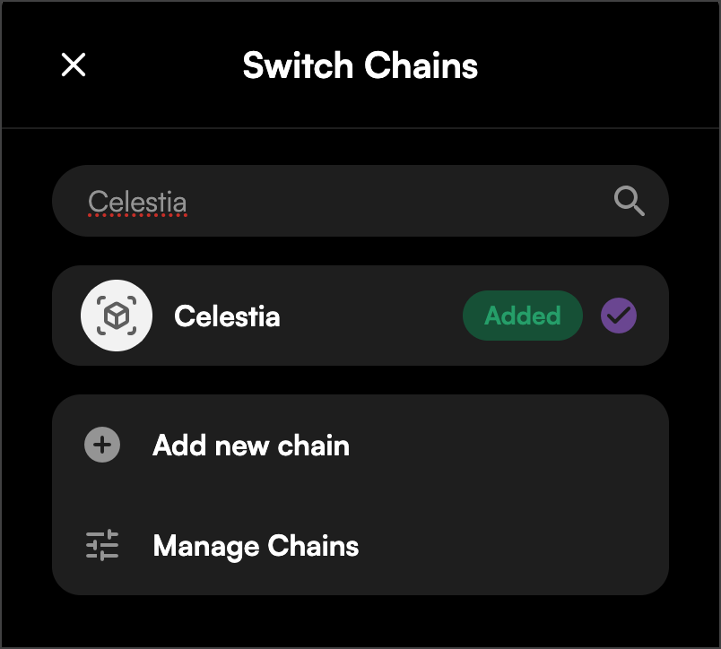 - Connect to Celestia by clicking on the chain dropdown in the top right corner.