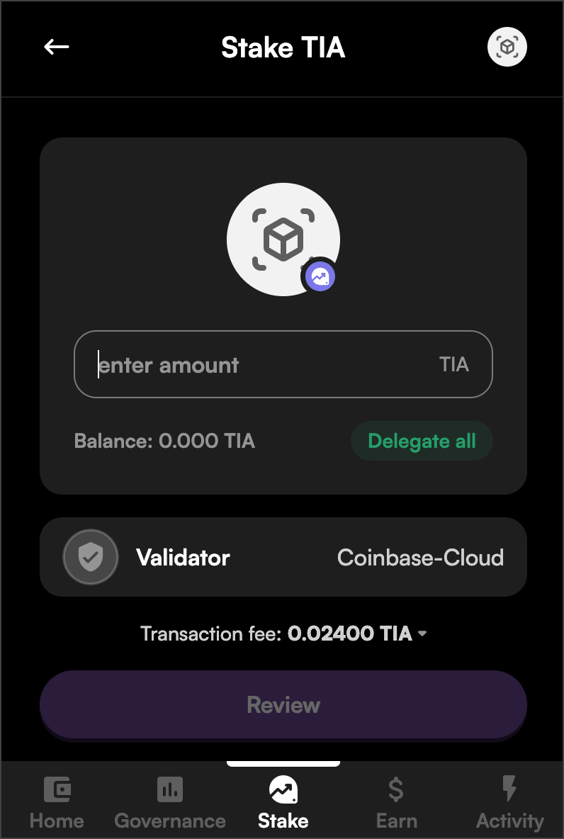celestiavaloper1geuw5f6u3n5l4ne2d2nze3fehxf023f7s8h08t or by searching Coinbase.- Enter in your desired amount of TIA to stake, click Review.