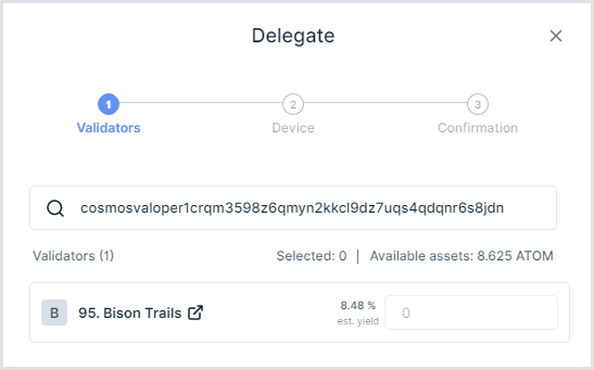 cosmosvaloper1crqm3598z6qmyn2kkcl9dz7uqs4qdqnr6s8jdn. - To the right of the estimated yield for the Coinbase validator, enter the amount of ATOM you would like to delegate and click Continue.