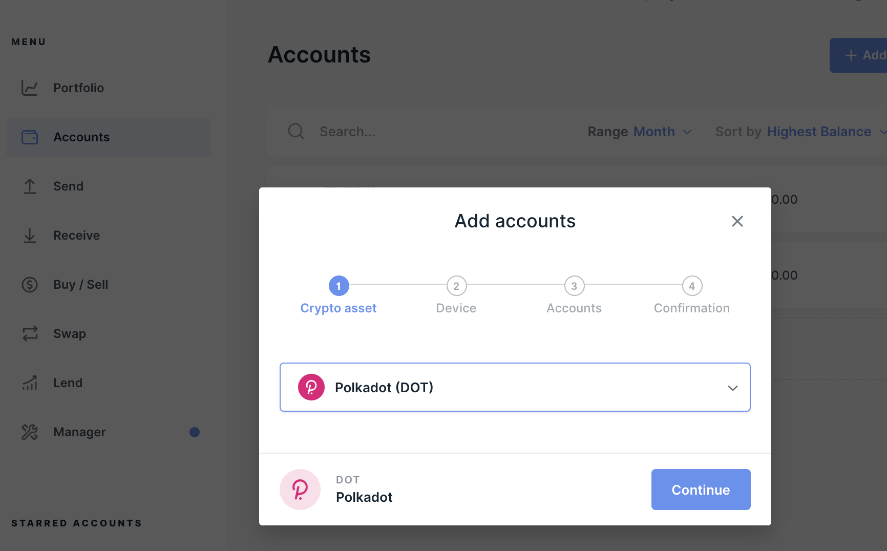 - Select Accounts within Ledger Live and click Add account.