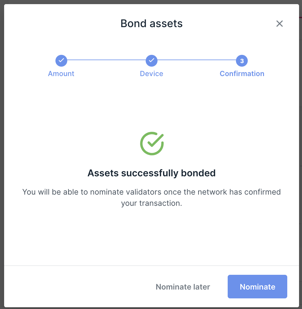 - Wait for the transaction to complete for your DOT to be bonded and ready for delegation.
